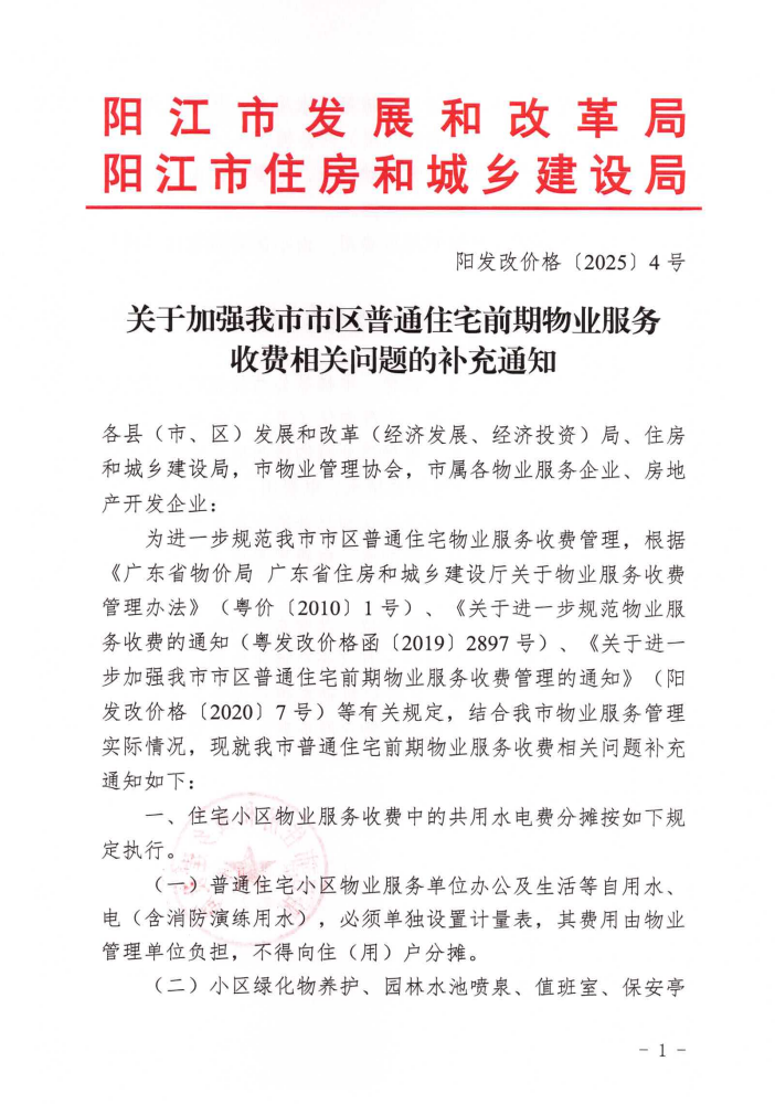 为进一步规范我市市区普通住宅物业服务收费管理,根据《广东省物价局 广东省住房和城乡建设厅关于物业服务收费管理办法》(粤价(2010)1号)、《关于进一步规范物业服务收费的通知(粤发改价格函(2019)2897号)、《关于进一步加强我市市区普通住宅前期物业服务收费管理的通知》(阳发改价格(2020)7号)等有关规定,结合我市物业服务管理实际情况,现就我市普通住宅前期物业服务收费相关问题补充通知如下: